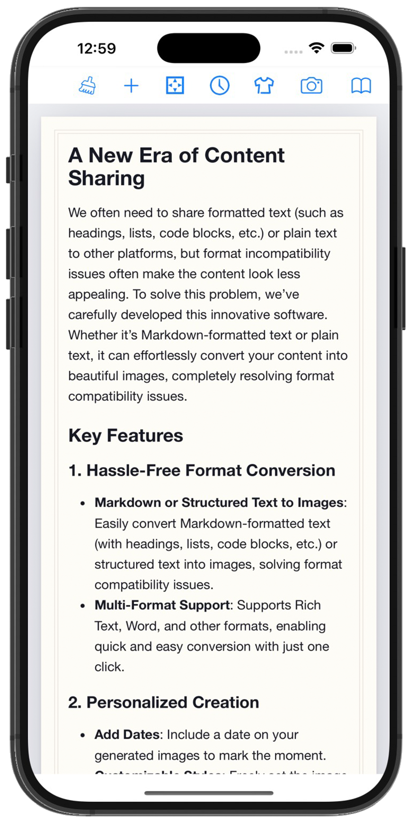 Note: If you want to generate an image from Markdown-formatted content (with headings, lists, code blocks, etc.) exactly as it is, click the content and then directly tap the sixth camera button without pressing the "Done" button on the keyboard.